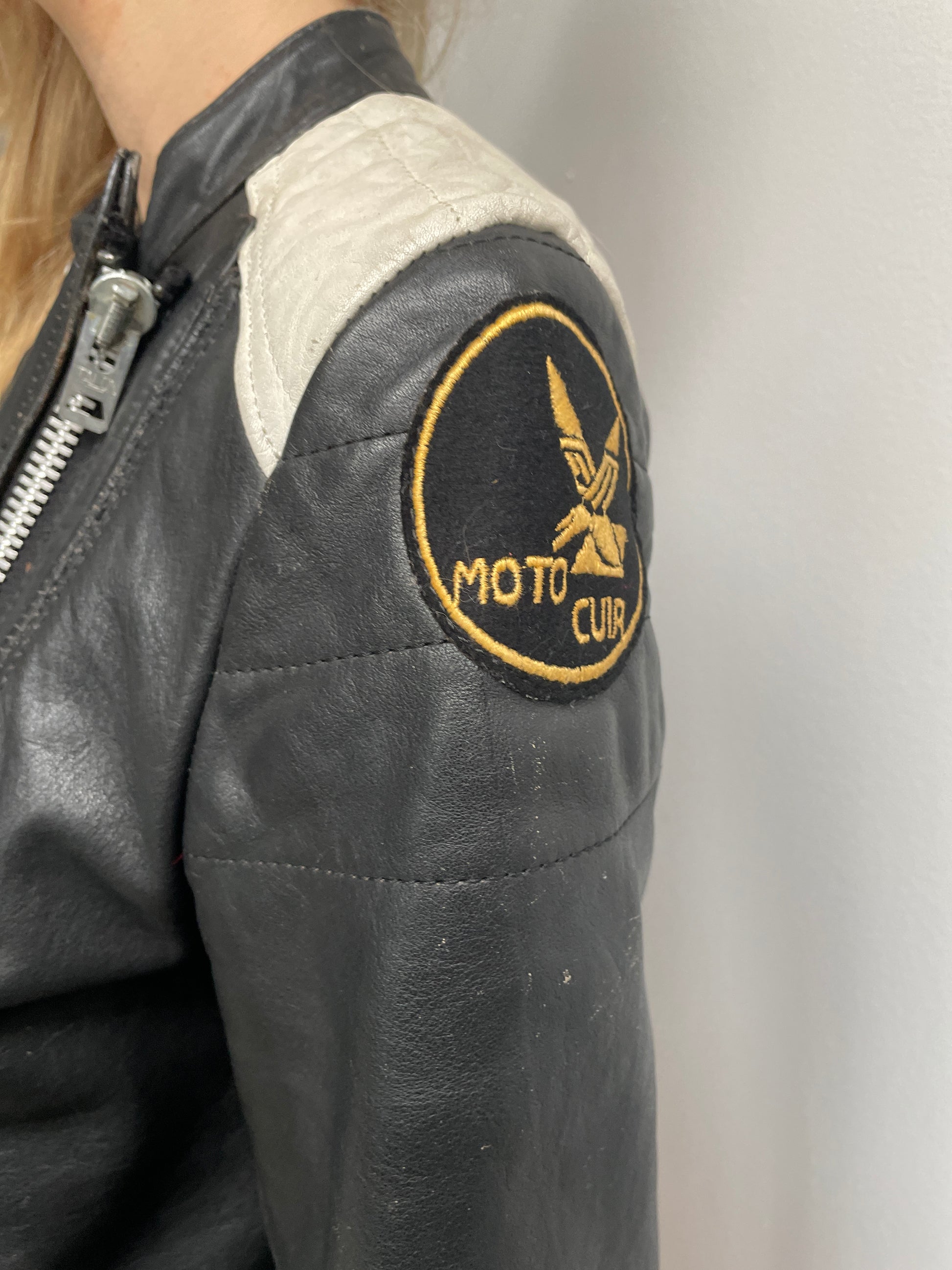 Authentic 1960s rare small size in this ultimate cool girl leather moto jacket. Worn to perfection. Excellent condition. Partially lined on inside. Moto Club patch on bicep, cafe racer style collar, all original zippers, original detailed buttons and white leather insert. They don’t make them like this anymore. Best fits size: 0-4 XSmall/Small.