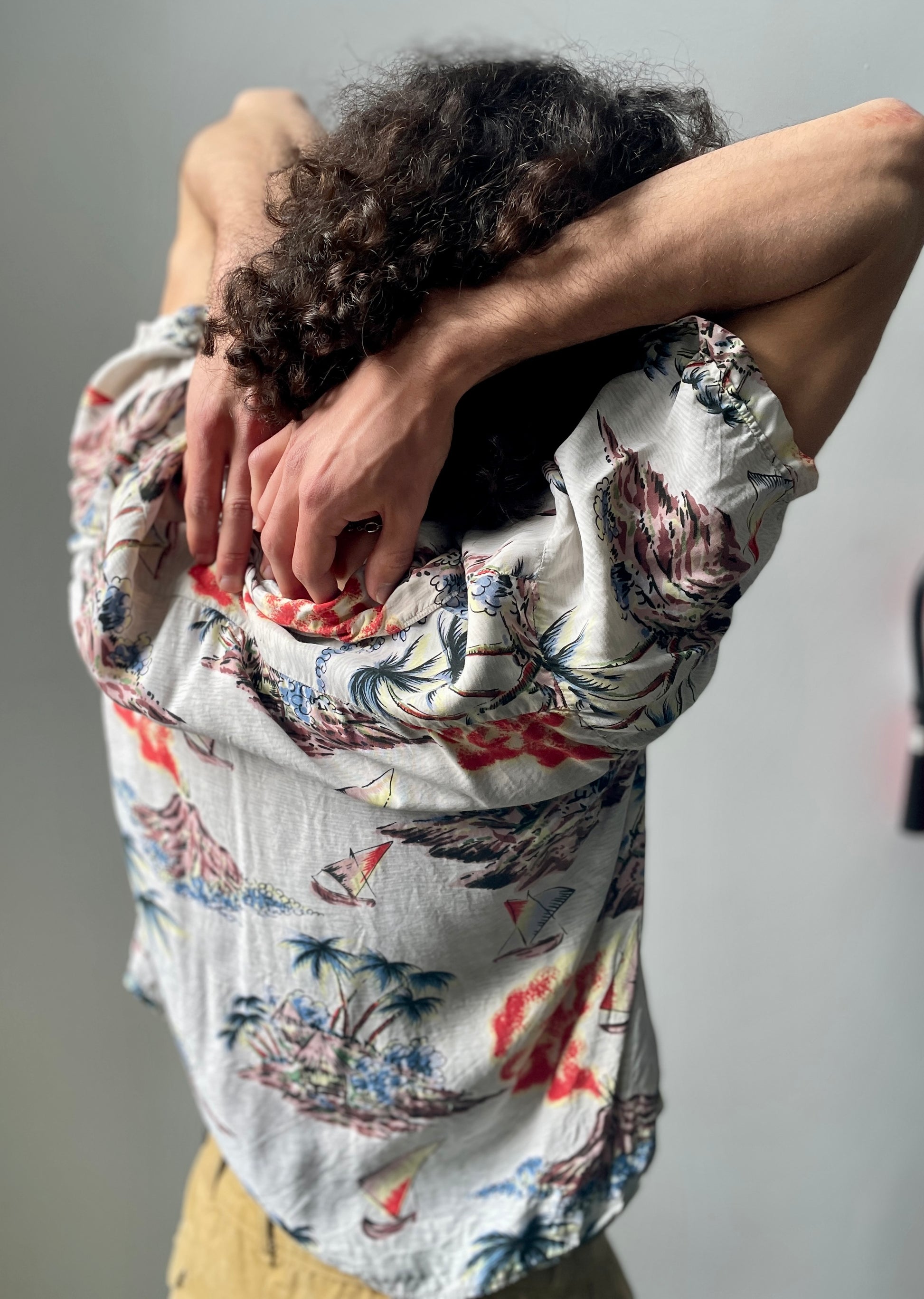 Light, cotton button up. Perfect for summer with a volcano, sailboat and tropical plant print. Easy breezy.